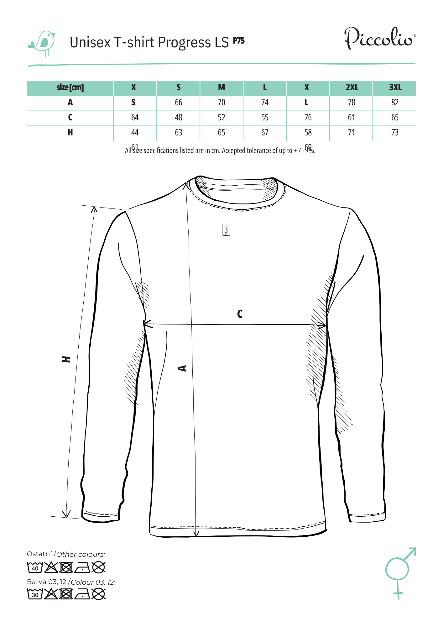 • Single Jersey, 100 % bavlna (zloženie sa môže líšiť – farba 03 – 97 % bavlna a 3 % viskóza, farba 12 – 85 % bavlna, 15 % viskóza)