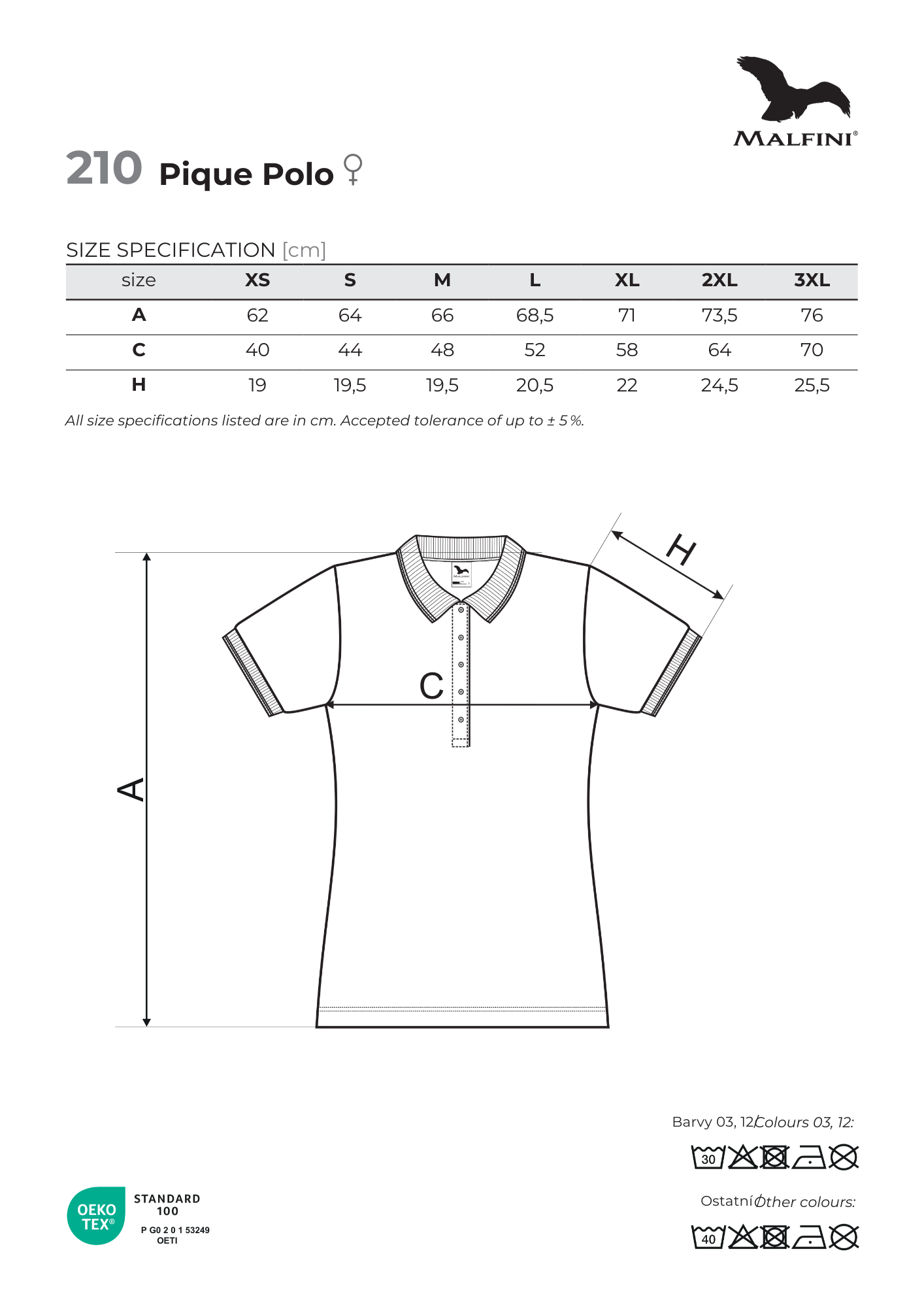 • Pique, 65 % bavlna, 35 % polyester (zloženie sa môže líšiť – farba 03 – 97 % bavlna a 3 % viskóza, farba 12 – 85 % bavlna, 15 % viskóza)